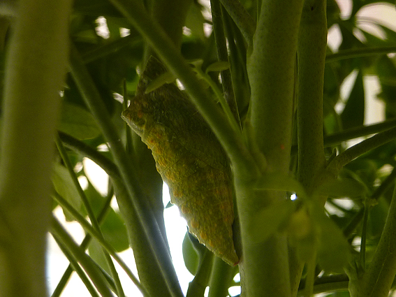 היום בבוקר זכינו לראות, איך פרפר יוצא מהגולם ומייבש את כנפיו. פרפר בקע לאחר 8 ימים בלבד. לפי מספר המקורות שמצאתי באינטרנט, חום הוא גורם העיקרי לזירוז התהליך. כנראה שמול החלון באגרטל זכוכית כמעט אטום ( פתח עליון היה מכוסה ברשת צפופה) , היה לו חם ונעים . לאומת זאת, צמח לא אהב את הסאונה ונבל.