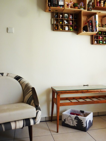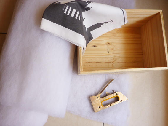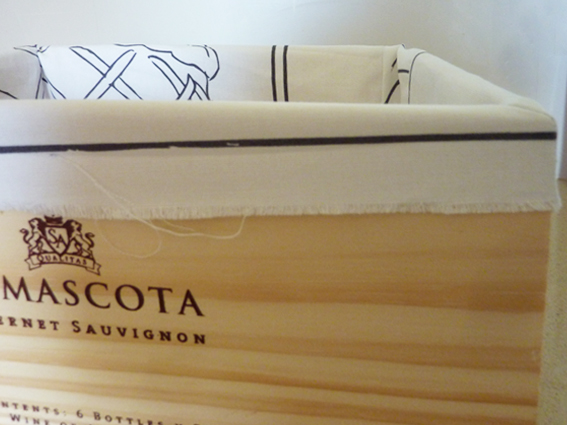 הלכתי על האופציה השנייה, לקחתי ארגז יין שקיבלנו, וריפדתי אותו. הריפוד נעשה משתי סיבות: עיקרית שהעולל לא ישרוט את עצמו, השניה לא פחות חשוב – אסטטיקה ויזואלית כי הרי מדובר בסלון המדוגם שלכם.