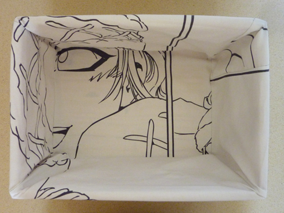 עכשיו החלק החיצוני, גוזרים מהבד רצועה המתאימה להיקף הארגז (סך אורך כל הדפנות + עוד קצת) ובגובה המתאים, תזכרו שצריך להספיק לקיפול פנימה ולתחתית. כלומר משהו כמו עוד 8 סנטימטר לגובה הרצועה. בדיוק באותן מידות צריכה להיות רצועת אקרילן. מקמו את הבד על מנת למקסם את ציור הבד. והתחילו להדק.