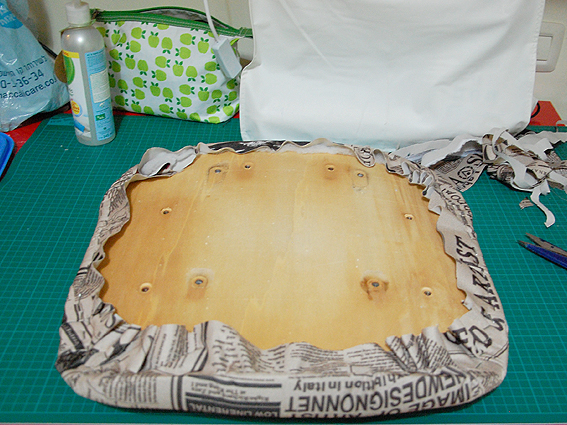 מעל הספוג ציפינו בשכבת אקרילן שהודקה בנפרד אל בסיס העץ. אותה ריססתי במבשם בדים ורק אחרי שכל החדר הריח כמו מכבסה נעימה, ציפינו בבד.