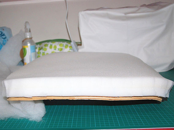 לריפוד לקחנו (נחשו מי…???) ספוג בעובי 2 ס"מ והדבקנו את שתי השכבות אחת לשניה, ע"י ספריי דבק, לשכבה כפולה של 4 ס"מ.