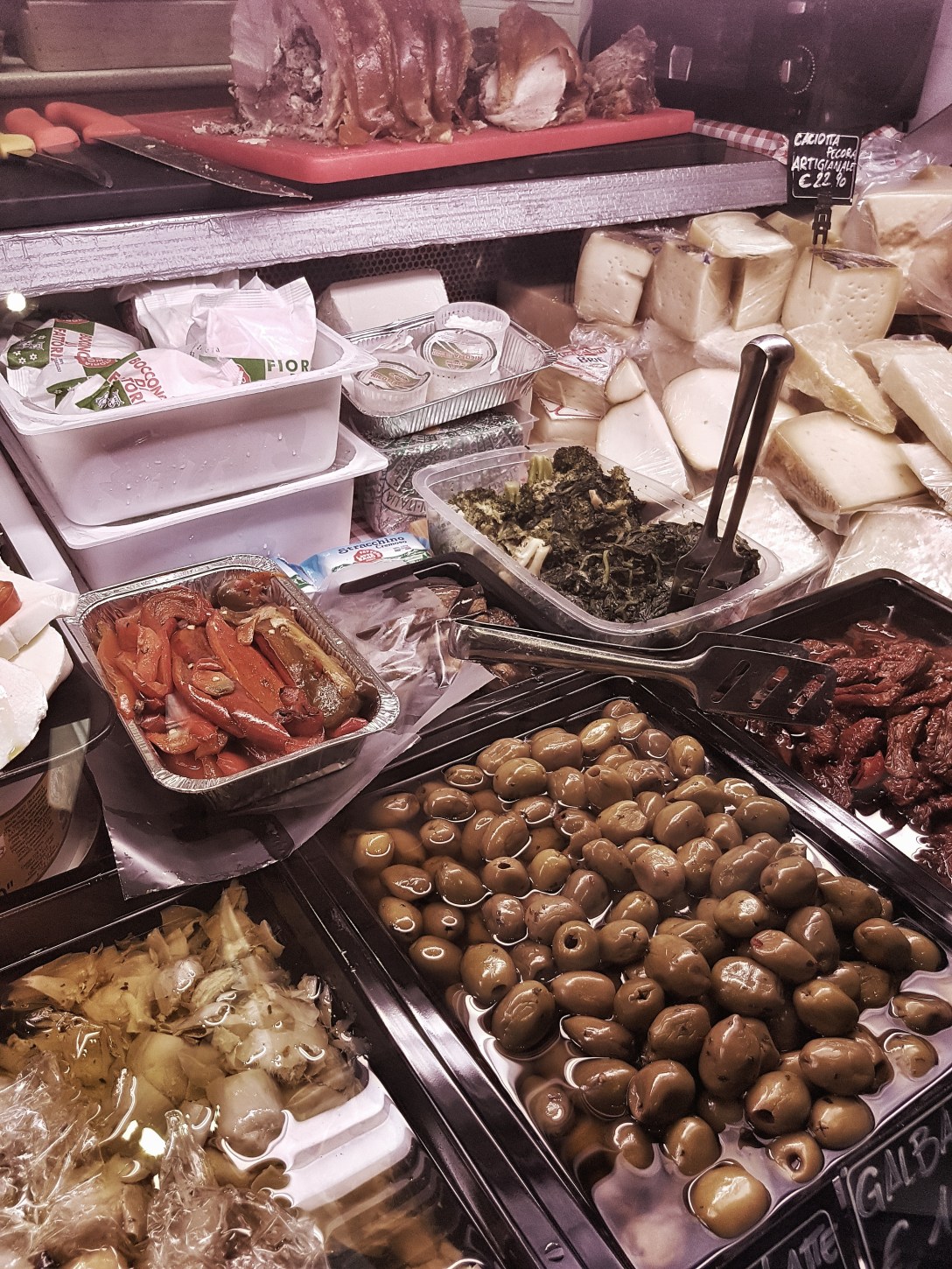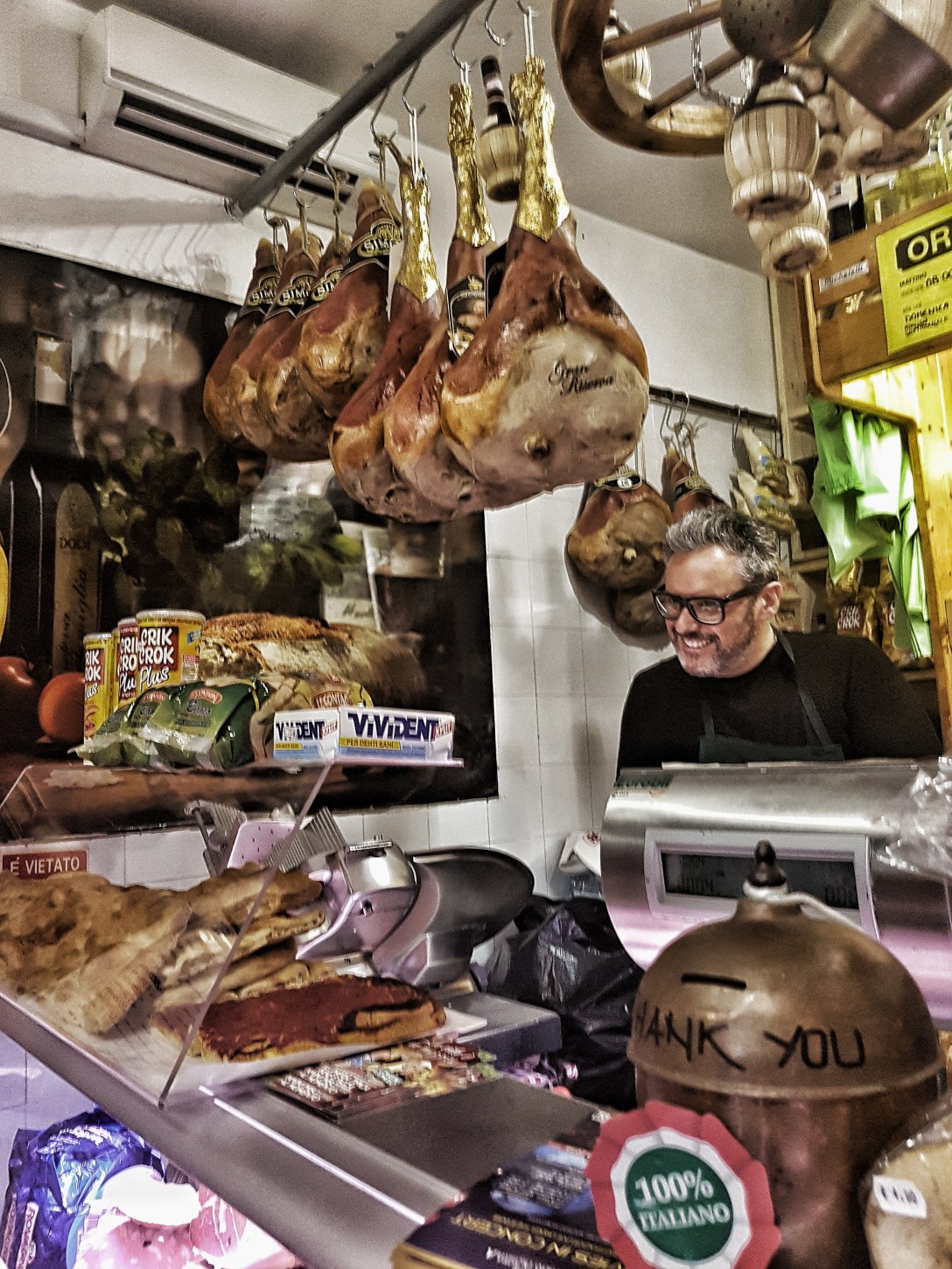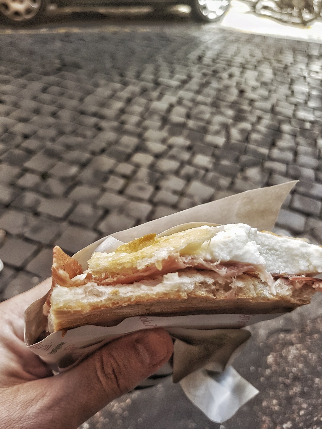 השארנו את המזוודה בדירה (במיקום מעולה) וישר יצאנו לחפש מה לאכול. אחרי חיפוש קצר בגוגל נכנסנו לסנדבצ'יה/ מעדניה (Panino con la porcheta) והזמנו פאניני אחד עם פרושוטו ומוצרלה והשני עם פורקטה (רולדה של בטן חזיר במילוי עשבי תיבול ). במקום מציעים מגוון רחב של תוספות מארטישוק מוחמץ ועד לעגבניות מיובשות. כל תוספת נשקלת בנפרד, מצטרפת למרכיבים האחרים שבחרתם ללחם איטלקי עם crust משובח ולכמה דקות בטוסטר, שזה המהות של פאניני – סנדביץ' בטוסטר.