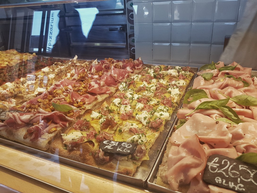 באומנות כמו באומנות ממוזיאון אתה יוצא רעב ולכן הלכנו לאכול פיצה. (Bonci Pizzarium) כדי לא להעליב את החברים בדרום אמריקה, אוכל להגיד שזו הפיצה הכי טעימה באירופה, מזרח התיכון ואסיה…אפשר לטעון שהייחודיות של פיצה בא מה -Crust ומהתוספות. בויטרינה תראו לפחות 15 הסוגי פיצה שנחתכת לפי רצונכם ואז נשקלת. פיצרייה נפתחת ב 11 , ורק אחרי שהעובדים שלחו תמונה של ויטרינה לבעלים וקיבלו OK. בכניסה לחנות יש פתקים עם מספרים כמו בקופת חולים על מנת לעזור בשעות העומס. חשוב לציין שמהלך החימום שנותן את הקריספיות חלק מהתוספות מורידים ומחזירים שוב , כדי לא לפגוע בטריות ובטעם שלהם. ברוב הפיצות גם לא תראו רוטב עגבניות, אלה ממרחים מיוחדים ( לדוגמה שעועית) ומעל גבינות איכותיות, פטריות, נקניקים וכו,.הפיצה לא זולה אבל שווה בהחלט.