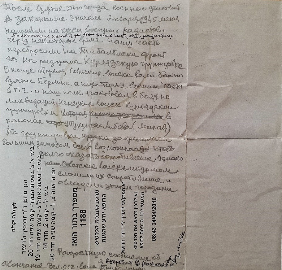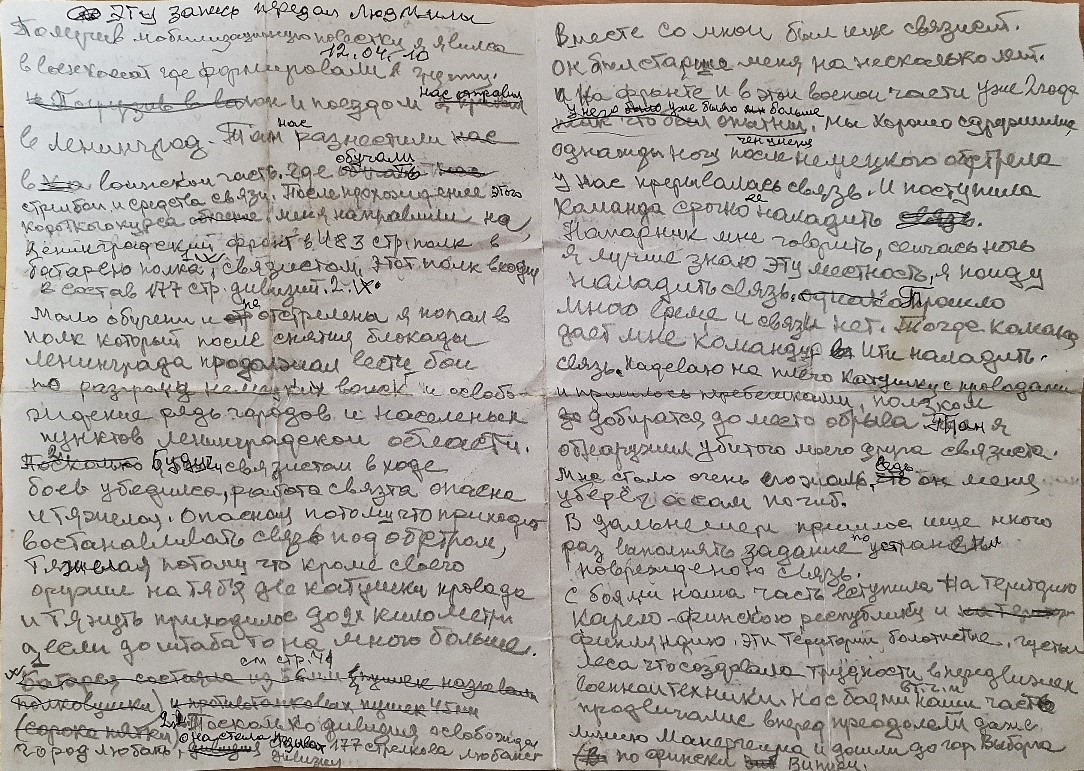 זכיתי לכמה שעות של שקט, קיפלתי את המעיל ונצמדתי לקיר הכי יבש שמצאתי בשוחה. חשבתי " איך הזמן טס", רק לפני שנה הייתי בבית וצפירת המשאית העירה אותי משינה וכעבור זמן קצר שמעתי דפיקה בדלת. התיק היה כבר מוכן, ויצאנו לנקודת איסוף בכיכר העירייה, שם אספו אותנו לקבוצה והעלו לרכבת ללנינגרד. מספר ימים לאחר ההגעה, העבירו אותנו לבסיס צבאי והתחילו ללמד איך לירות ולתפעל מכשירי קשר. אחרי קורס קצר שלחו אותנו לחזית בפאתי העיר לנינגרד. כבר ביום הראשון בגדוד הכרתי את אנדריי – הוא התגייס שנתיים לפניי, אבל התחברנו מיד. הייתי תחת חסותו, ולמדתי ממנו המון. משימותינו התמקדו בשחזור הקווים בין האוגדה למטה, ובהנחת קווים חדשים תוך התקדמות כוחותינו. העבודה הייתה קשה, כי חוץ מציוד אישי סחבנו על הגב גלילים של חוט תקשורת שצריך למשוך ל-2 ק"מ לפחות.