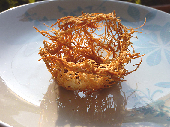 סלסילת קדאיף לאחר אפייה. תשתדלו שהאטריות לא יהיו צמודות מדי והשכבה לא תהיה עבה מדי.